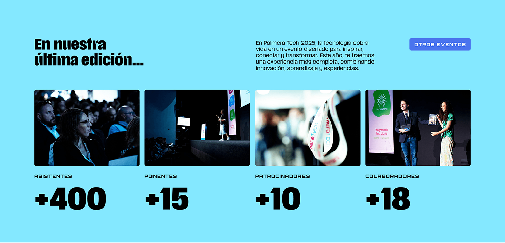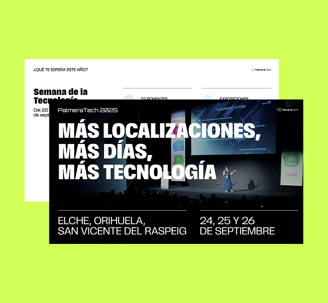 Este proyecto ha sido una oportunidad para crear un sistema visual claro, flexible y escalable, capaz de ordenar la complejidad del evento y mejorar la experiencia de sus distintos públicos. Una identidad que acompaña la energía y ambición de PalmeraTech, reforzando su posicionamiento como punto de encuentro clave para la innovación y la tecnología.